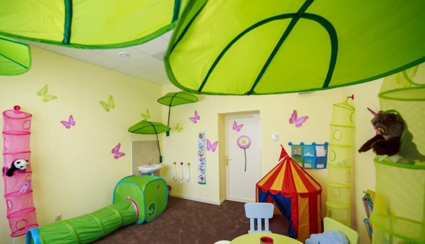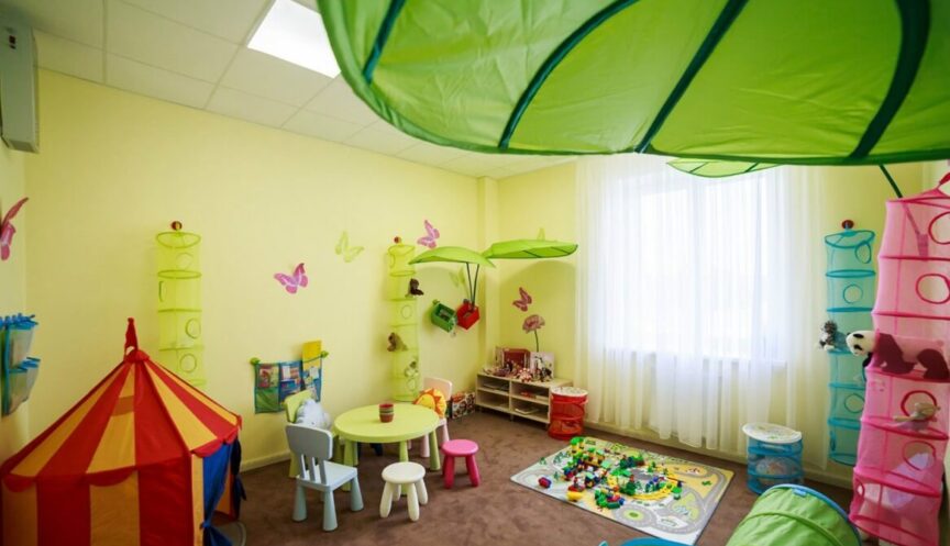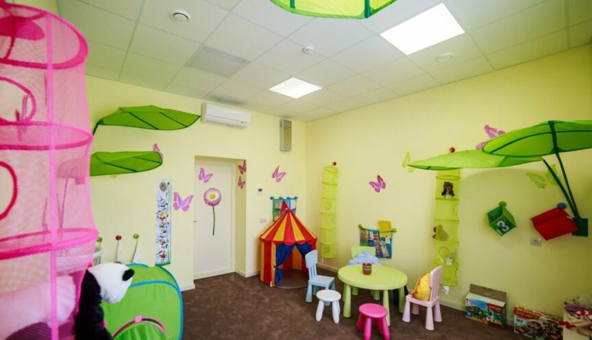 – Просторное игровое пространство с игрушками, книгами и мультфильмами.